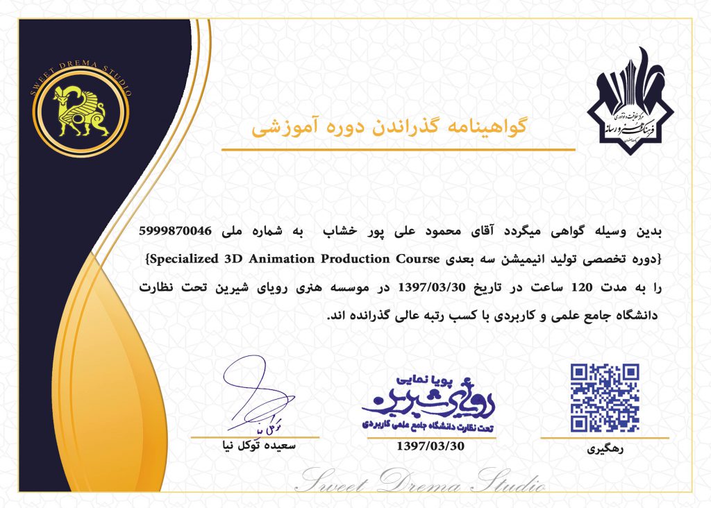 بدین وسیله گواهی میگردد آقای محمود علی پور خشاب به شماره ملی 5999870046